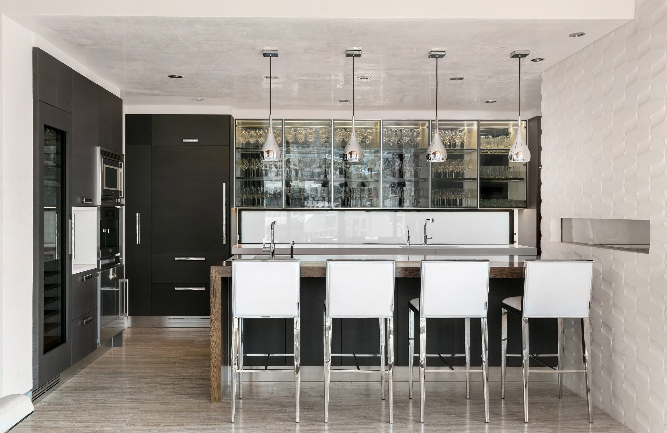 The custom chef’s kitchen is exquisitely milled with bespoke Italian cabinetry along with sleek white quartz countertops. The appliances include two 36” Sub Zero refrigerators, a 48” Wolf double oven and range, a supplemental 36” Gaggenau convection oven with broiler, a 24” dishwasher, and a built-in Miele espresso maker. Adjacent to the kitchen is a ten-foot island with a 60” direct vent, and a linear burner fireplace clad in dimensional Italian limestone.