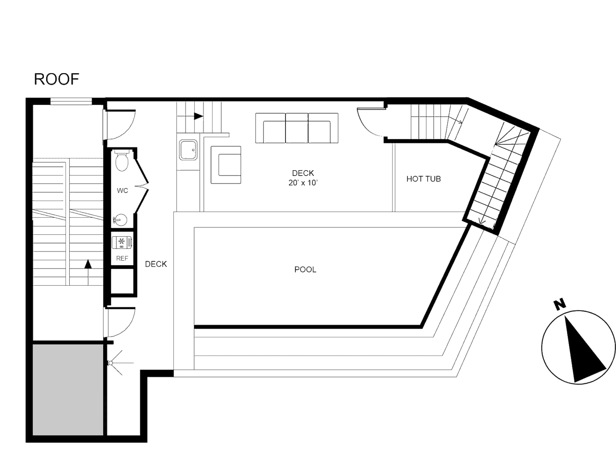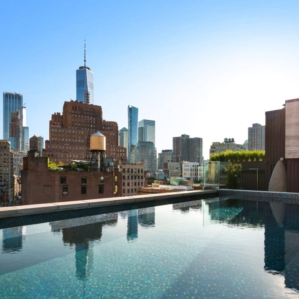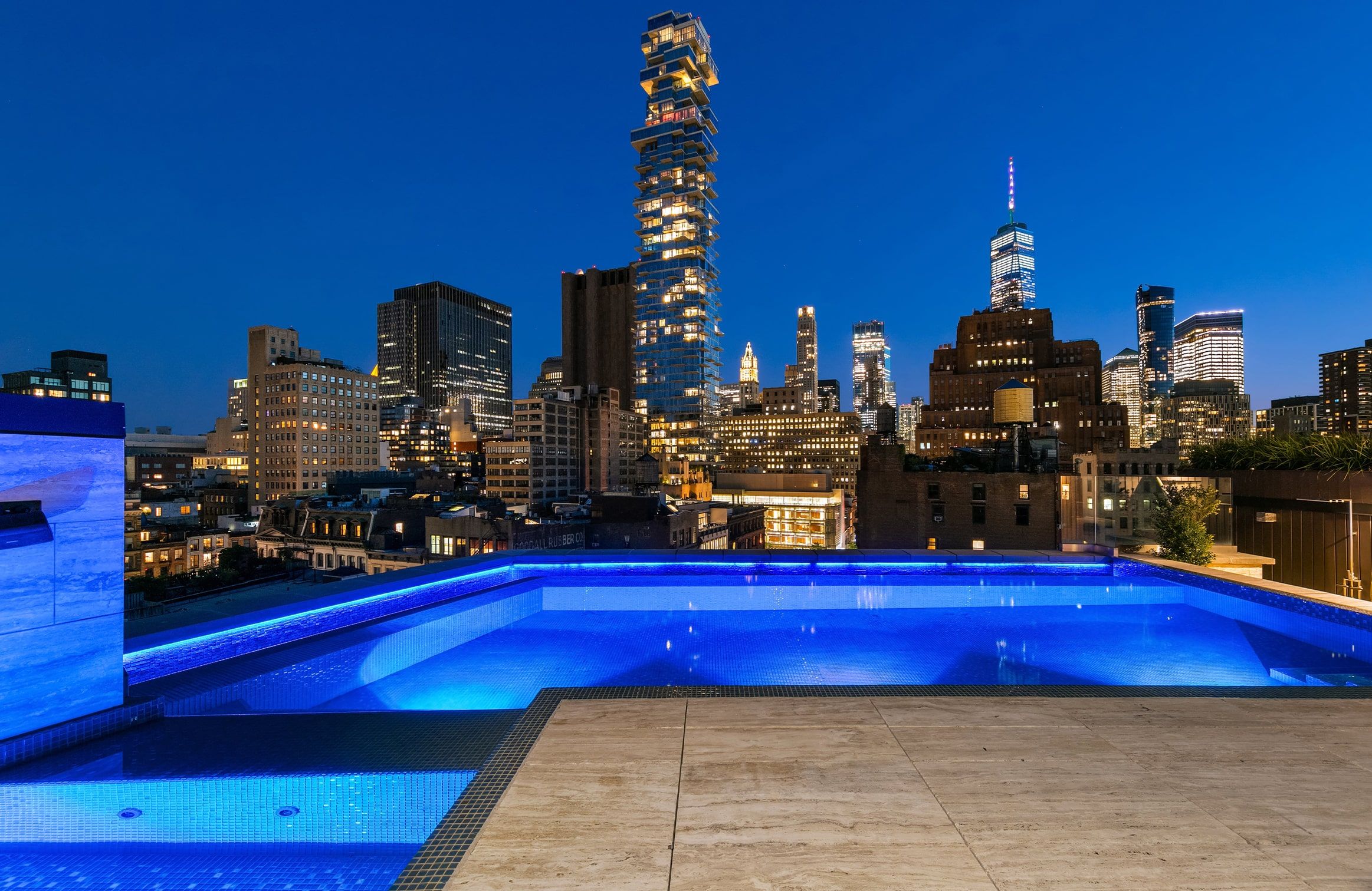 The “piece de resistance” is the rooftop sundeck featuring an infinity-edge swimming pool and jacuzzi. Situated on the top floor of this incredible triplex penthouse, the color-changing pool has unobstructed views of downtown Manhattan as its backdrop. To top everything off, the rooftop includes a 90” TV, a surround sound system, an outdoor shower, and a built-in kitchen with a 48” Wolf grill and side burner along with a sink, ice maker, and refrigerator.