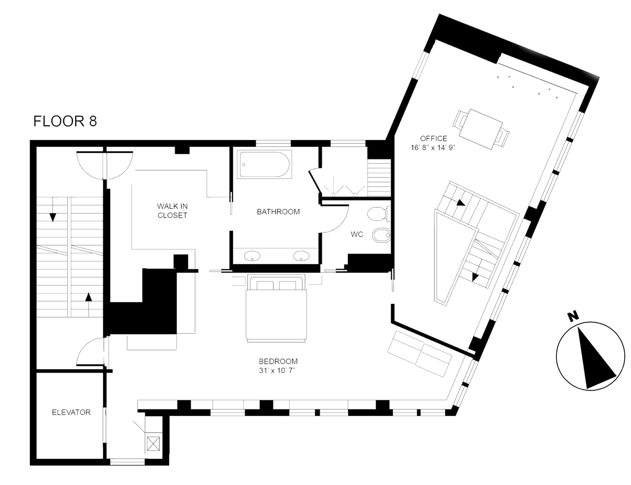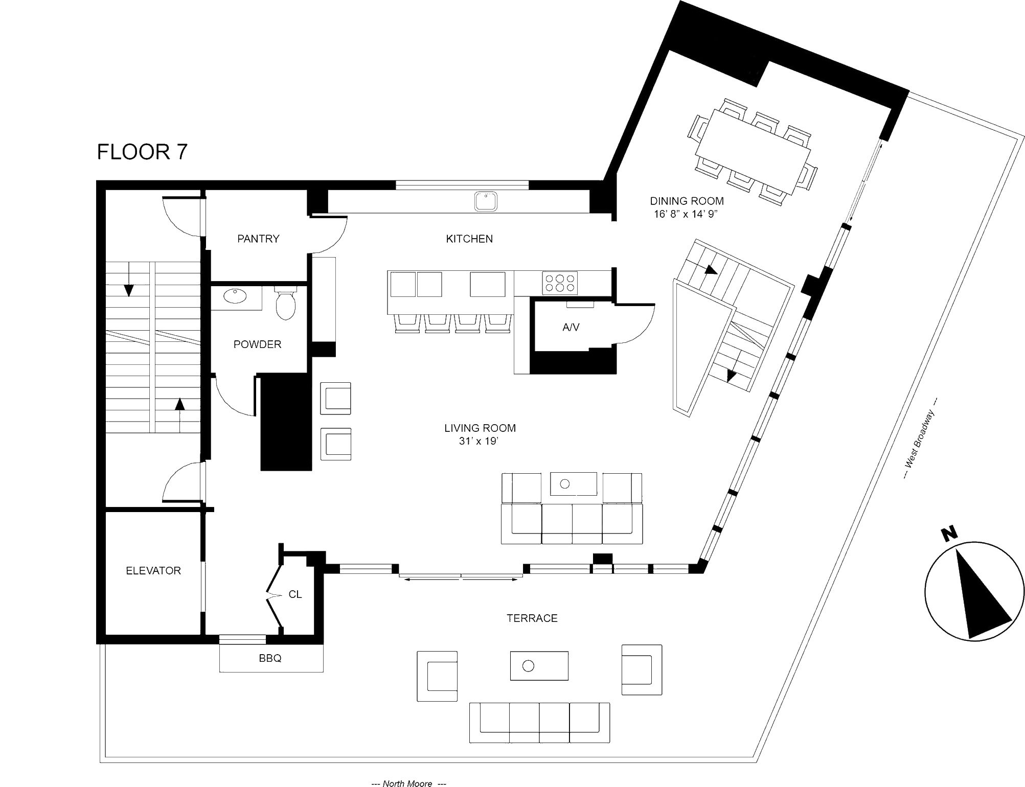 With 5,500 square feet of interior space and 2,200 square feet of private outdoor space, the triplex penthouse at 1 North Moore is truly a mansion in the sky. The residence sits atop an ultra-exclusive, boutique six-condominium building. The unit is accessed via private entrances on the seventh, eighth, and ninth floors. The entire seventh floor is wrapped by custom glass sliding doors giving you the ability to enjoy the epitome of indoor/outdoor living all at once. Upon entering, you are immediately drawn in by the open floor plan which is finished with vein-cut unfilled travertine flooring throughout.