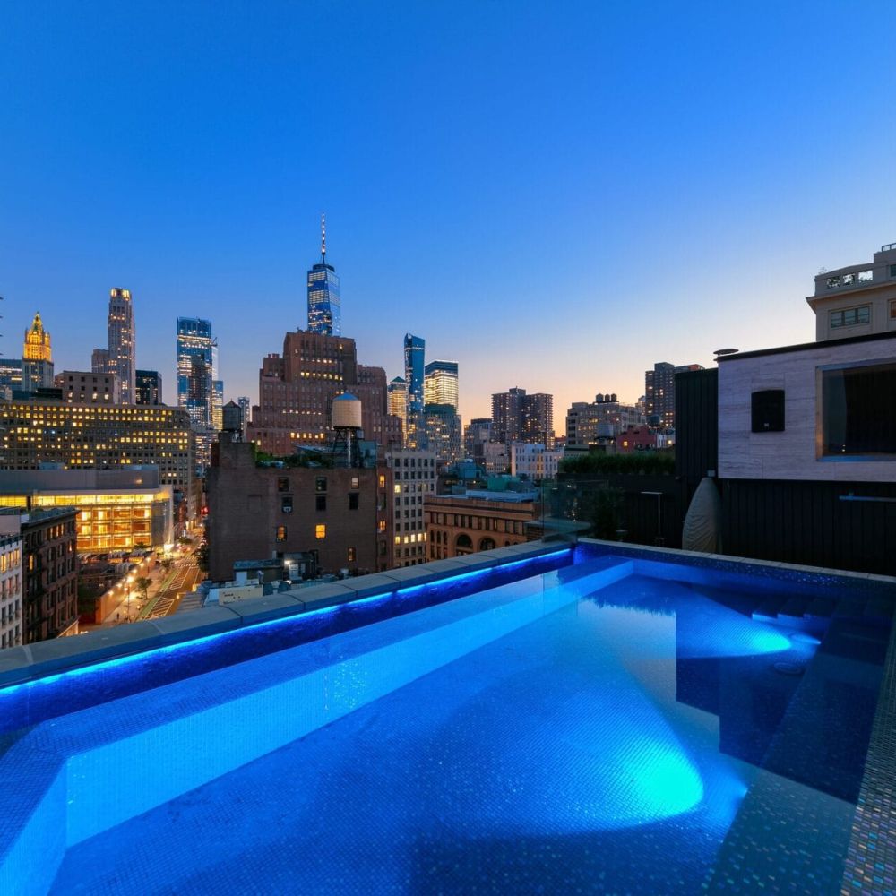 Now for the “piece de resistance” – the rooftop sundeck featuring an infinity-edge swimming pool and jacuzzi. Situated on the top floor of this incredible residence, the color-changing pool has unobstructed views of downtown Manhattan as its backdrop. To top everything off, the rooftop includes a 90” TV, a surround sound system, an outdoor shower, and a built-in kitchen with a 48” Wolf grill and side burner along with a sink, ice maker, and refrigerator.