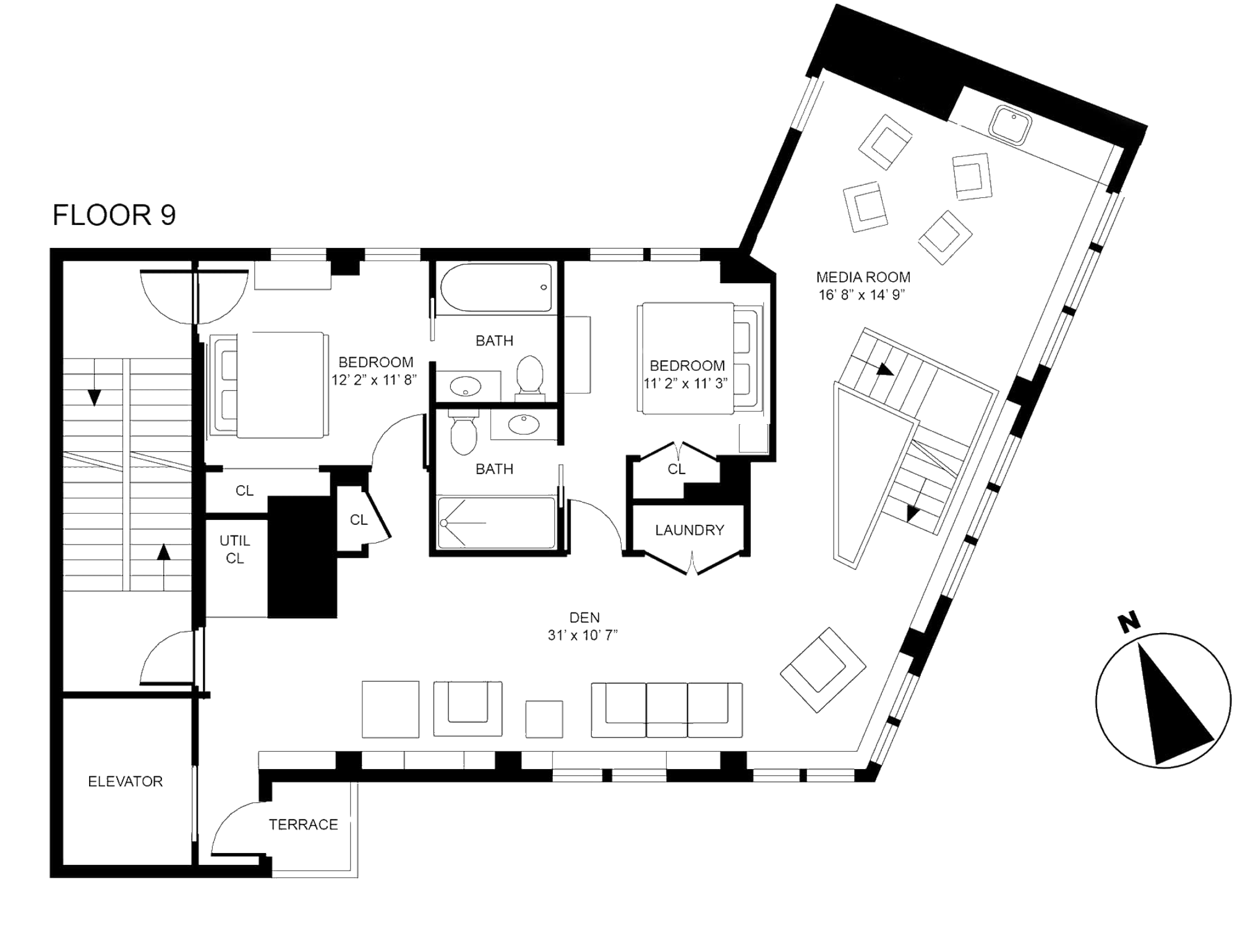 On the ninth floor, the lounge area and media room provide another zone to escape to for relaxation. Complete with a refrigerator and freezer, there is no amenity missing to enjoy the perfect movie or game night. The ninth floor features two more guest suites along with two full bathrooms, a laundry room, and a southeastern-facing balcony overlooking North Moore. Currently laid out as a three-bedroom level, the media room on the ninth floor can be converted into a fourth bedroom if desired.